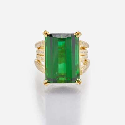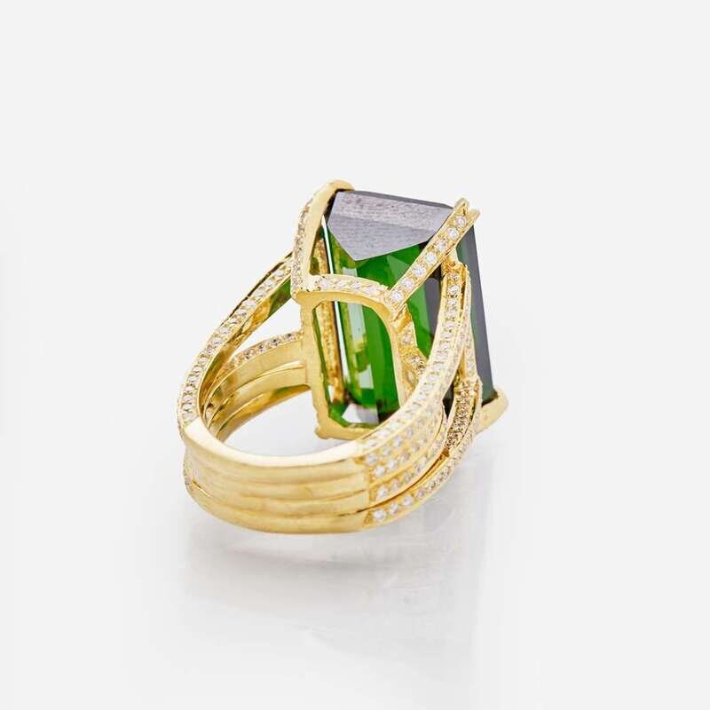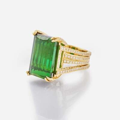 An 18K yellow gold ring designed as four bands, reaching out to become claw settings for an 18.5 x 12.5mm (approximately 20.00 carat) green emerald-cut tourmaline, set with round brilliant-cut diamonds covering the band. Diamonds are near colorless (G - H), with VS1 - VS2 clarity. Total estimated weight of diamonds: 1.50 carats.