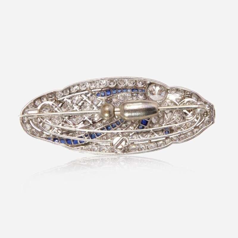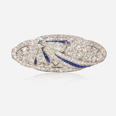 An oblong platinum brooch also functioning as a pendant, designed as a bow and set with one old European-cut diamond weighing approximately 0.70 carats, one hundred twenty-three smaller old European-cut diamonds, and thirty-one French-cut sapphires measuring from approximately 1.04mm x 1.56mm at the smallest to 1.64mm x 1.52mm at the largest. Diamonds are near colorless (H - J), with VS clarity. Total estimated weight of diamonds: 5.00 carats.