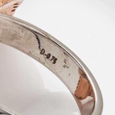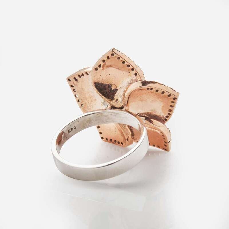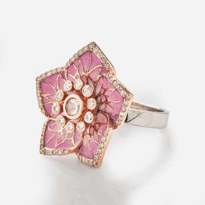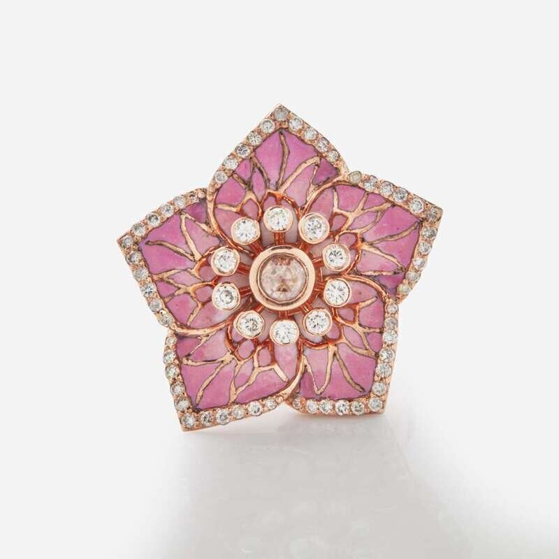 A pink enamel ring designed as a flower, centering a bezel-set round-cut pinkish diamond weighing approximately 0.17 carats, surrounded by a halo of round-cut diamonds, with further round-cut diamonds accenting the border of the flower. Accent diamonds are near colorless (G - J), with SI - I clarity. Total estimated weight of diamonds: 0.75 carats.