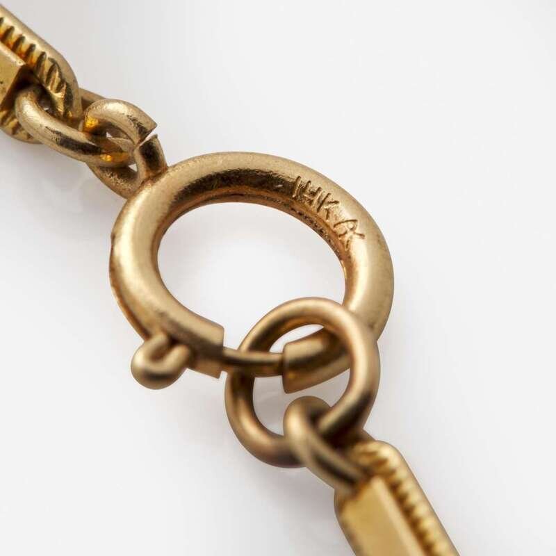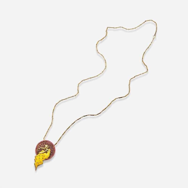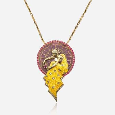 A 14K yellow gold bar-link chain with a 14K yellow gold pendant depicting a female figure crafted from yellow enamel and purple plique-à-jour enamel, and accented by forty-three round-cut rubies each measuring from approximately 1.60mm at the smallest to 2.40mm at the largest, and thirty-one round brilliant-cut diamonds. Diamonds are near colorless (H - I), with SI clarity. Total estimated weight of diamonds: 0.10 carats.