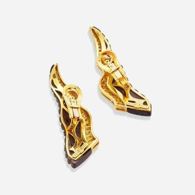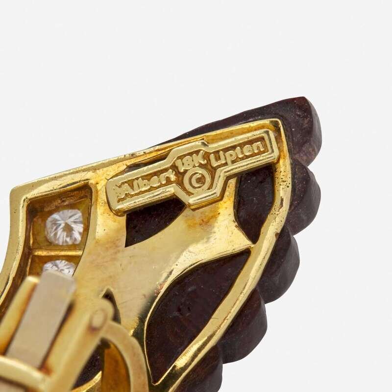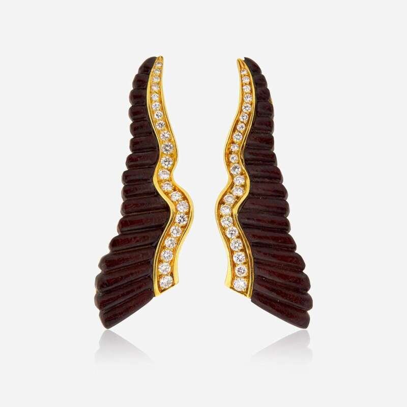 A pair of earrings by Albert Lipten, with omega clip backs suitable for unpierced ears, designed to feature a freeform section of carved wood, accented by a parallel line of diamonds. Forty-two round brilliant-cut diamonds altogether, near colorless (G - H), with VS2 - SI1 clarity. Total estimated weight of diamonds: 1.40 carats.
