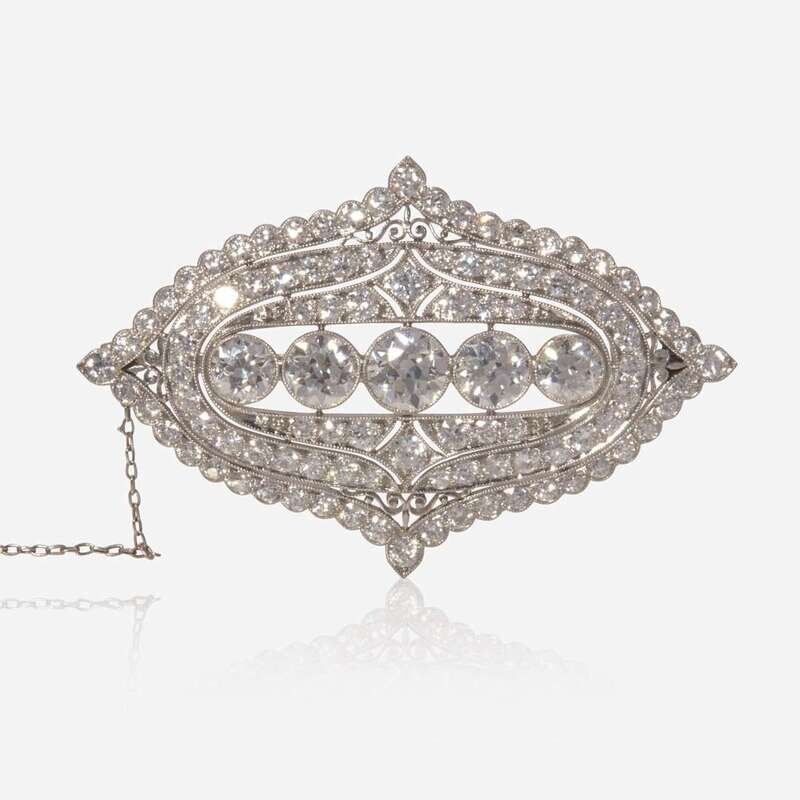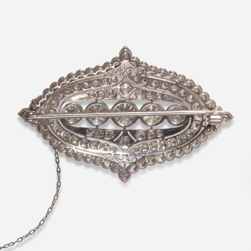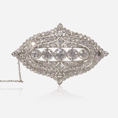 An early 20th century platinum brooch, centering a line of old European-cut diamonds, the center diamond weighing approximately 0.67 carats, the two diamonds flanking it each weighing approximately 0.45 carats, and the two diamonds on the end each weighing approximately 0.30 carats, accented by one hundred one old European-cut diamonds in a geometric openwork pattern. Diamonds are near colorless (H - I), with VS - SI clarity. Total estimated weight of diamonds: 6.77 carats.