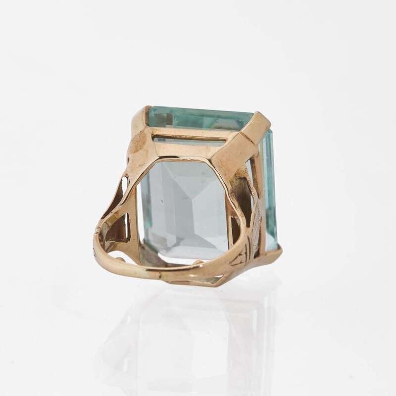 A 14K yellow gold ring featuring an emerald-cut aquamarine measuring approximately 21.41mm x 17.28mm, approximately 27.00 carats, with engraved design on shoulders.