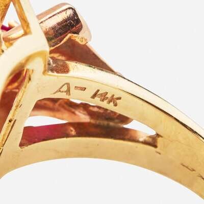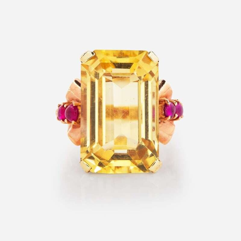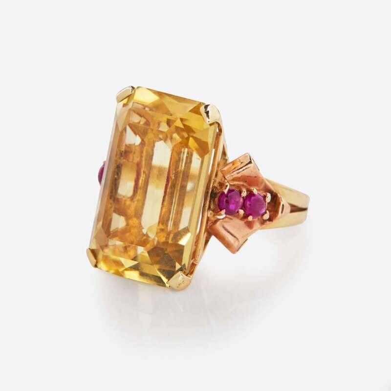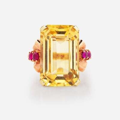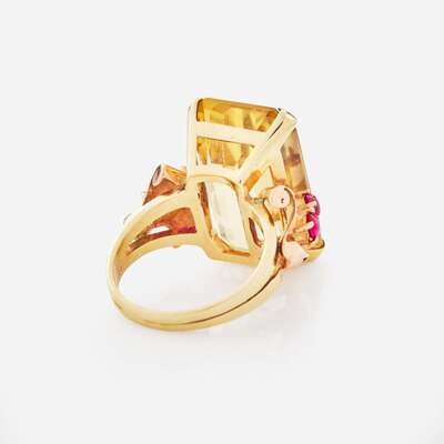 A retro 14K two-tone yellow and rose gold ring, centering an emerald-cut citrine measuring approximately 21.45mm x 13.55mm x 9.73mm, approximately 18.00 carats, accented by four cabochon rubies each measuring approximately 3.00mm x 3.30mm.