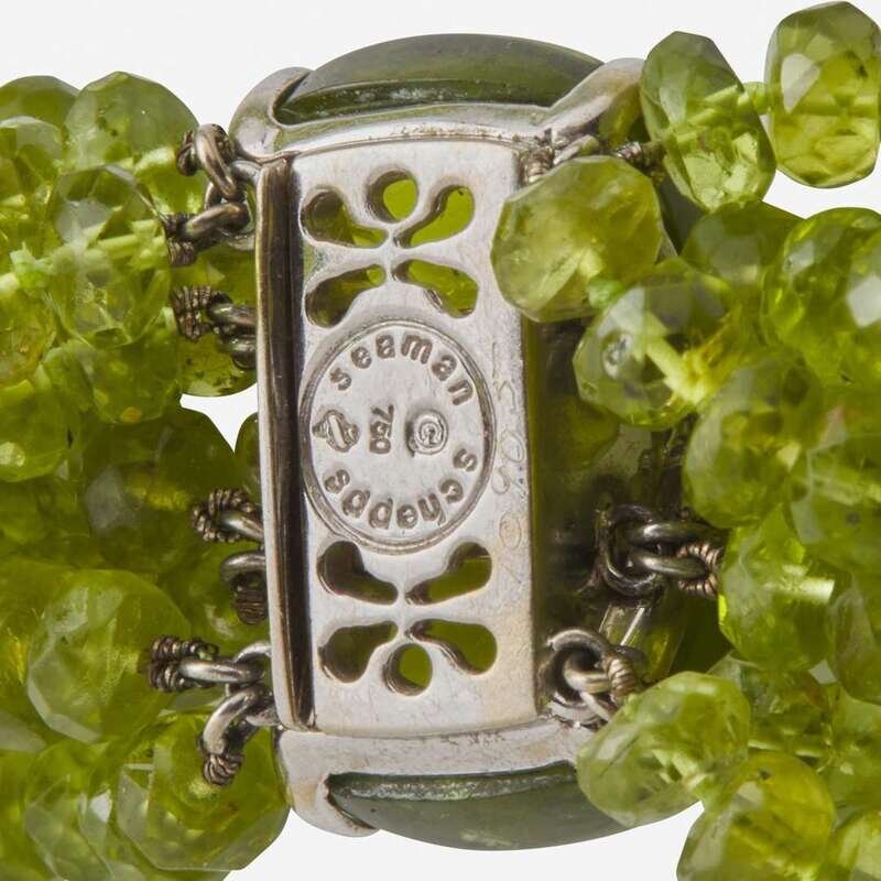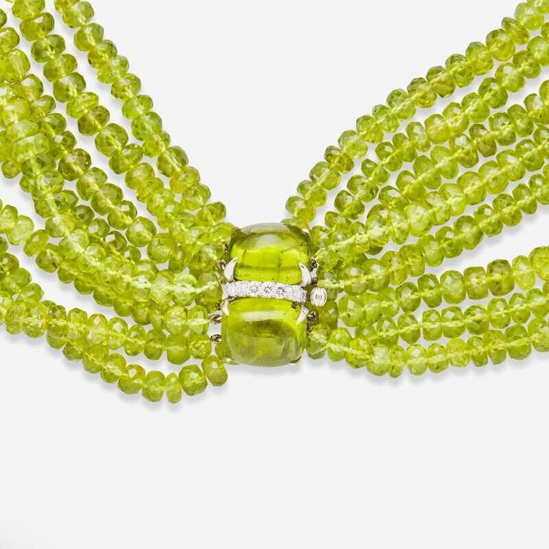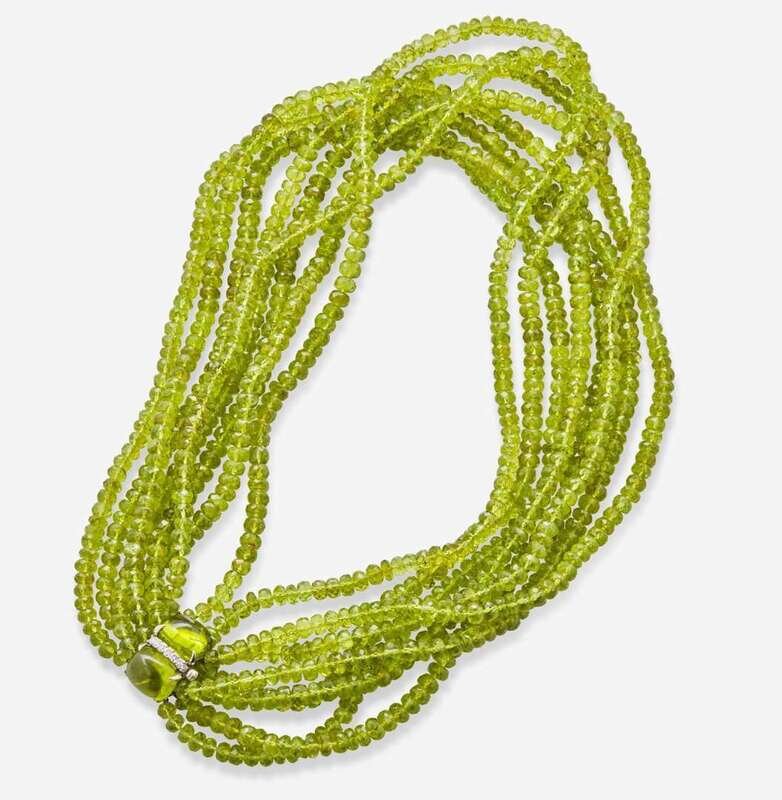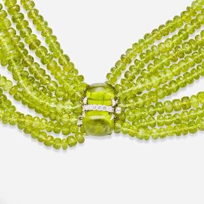 An 18K white gold multi-strand necklace by Seaman Schepps, featuring faceted peridot beads each measuring from approximately 3.20mm at the smallest to 6.00mm at the largest, with an 18K white gold clasp set with two cabochon peridot each measuring approximately 14.13mm x 11.80mm and seven round brilliant-cut diamonds. Diamonds are near colorless (G - I), with VS clarity. Total estimated weight of diamonds: 0.35 carats.