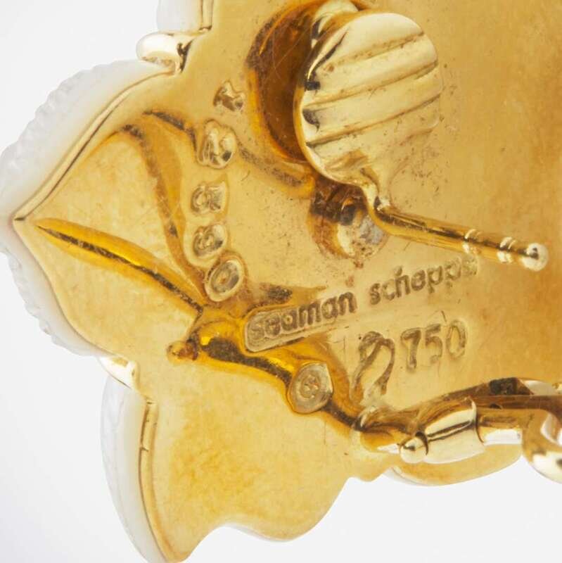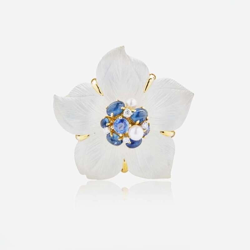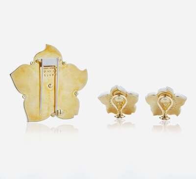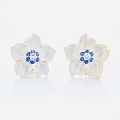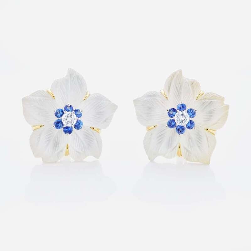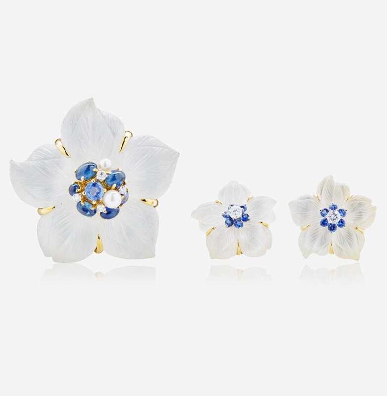 An 18K yellow gold suite of ear clips and matching brooch, designed as flowers with rock crystal petals on a mother-of-pearl backing, and pearl, diamond, and sapphire accents. Diamonds are near colorless (G - J), with VS clarity. Total estimated weight of diamonds: 0.60 carats.