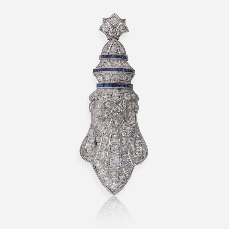 An Art Deco platinum, diamond, and synthetic sapphire pendant/brooch. Designed in an elongated chandelier style, the brooch features old European-cut diamonds in a variety of sizes, G - I in color, with SI - I clarity. Total estimated weight of diamonds: 5.00 carats.