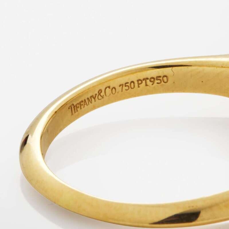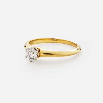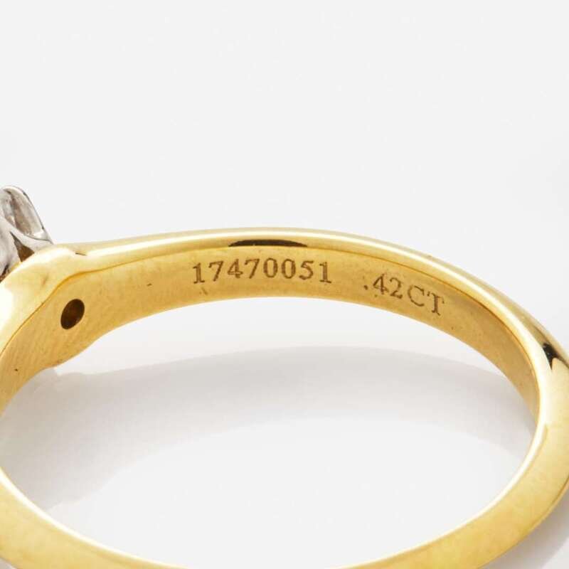 A vintage Tiffany & Co. 18K yellow gold and platinum "The Tiffany Setting" solitaire engagement ring circa 1990's centering a round brilliant-cut diamond weighing approximately 0.42 carats, near colorless (D), with VS1 clarity. Accompanied by GIA Report Number: 2175075721.