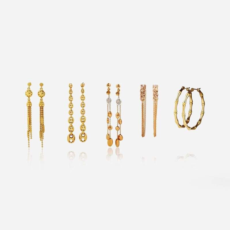 An assorted collection of jewelry by contemporary designers, including a pair of 18K yellow gold Gucci tassel earrings, a pair of 18K rose and white gold Roberto Coin dangle earrings, an 18K yellow gold bamboo-style pair of hoops with Italian hallmarks, a pair of 18K yellow gold anchor-link dangle diamond earrings with Italian hallmarks, and a pair of 14K rose gold chain link earrings.