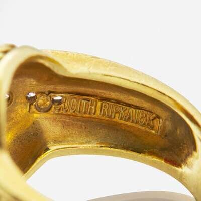A collection of contemporary yellow gold rings, including an 18K yellow gold ring featuring an interlocking square design and set with sixteen round brilliant-cut diamonds, approximately 0.45 carats altogether, near colorless (G - H), with VS clarity, a 14K yellow gold ring featuring a cabochon black star sapphire measuring approximately 9.91mm x 7.15mm, a 14K yellow gold ring featuring a cabochon cat's eye chrysoberyl, and an 18K yellow gold Judith Ripka ring featuring an oval-cut garnet measuring approximately 9.83mm x 7.69mm and six round brilliant-cut diamonds, approximately 0.10 carats altogether, near colorless (G - H), with VS clarity. Total estimated weight of diamonds: 0.55 carats.