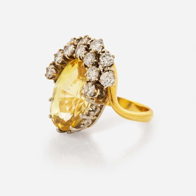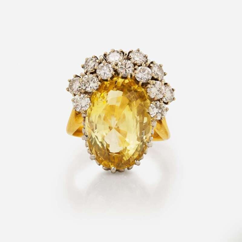 An 18K yellow gold ring centering an oval-cut yellow sapphire measuring approximately 17.30mm x 12.68mm, approximately 14.00 carats, accented by thirteen round brilliant-cut diamonds set in platinum. Diamonds are near colorless (H - I), with SI - I clarity. Total estimated weight of diamonds: 1.70 carats.