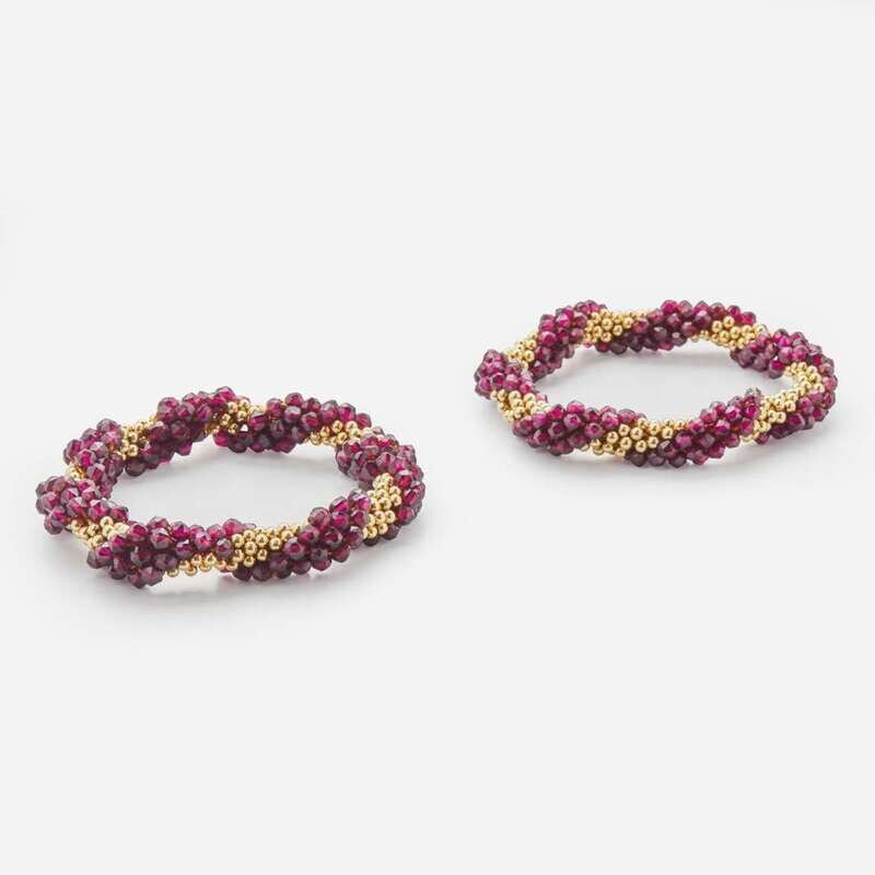 A 14K yellow gold and gemstone suite, including two torsade bracelets, and earrings fashioned from 14K yellow gold and faceted garnet beads.