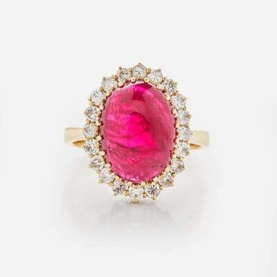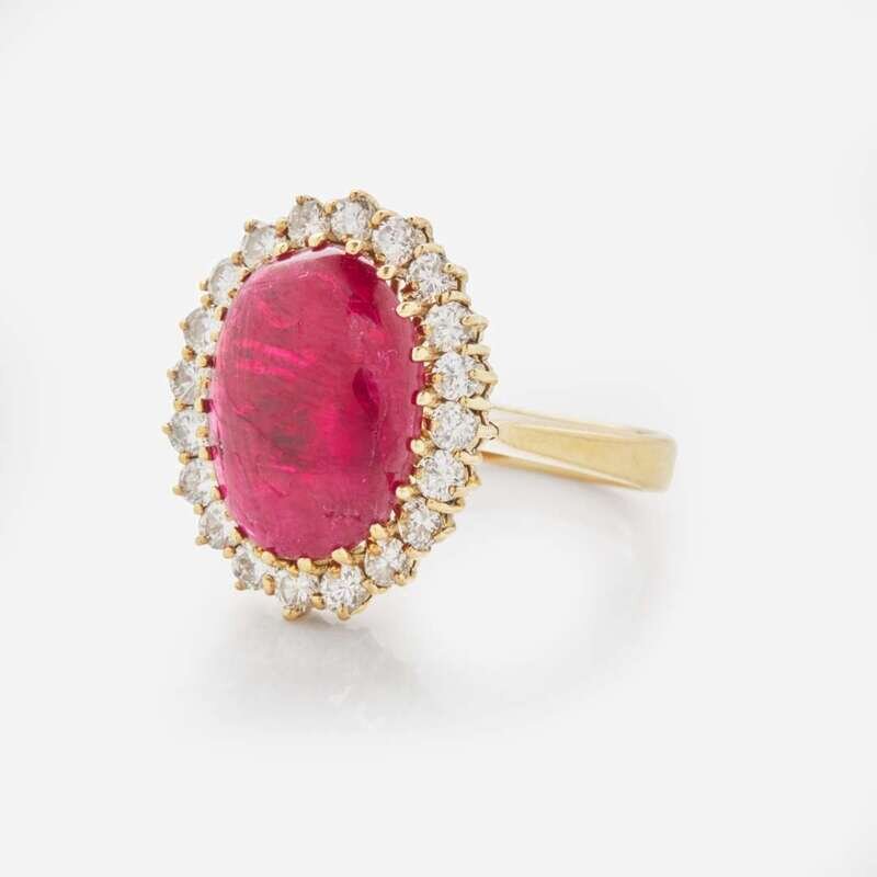 An 18K yellow gold ring featuring an oval cabochon ruby measuring approximately 13.85mm x 10.34mm, approximately 5.75 carats, surrounded by a halo of twenty round brilliant-cut diamonds. Diamonds are near colorless (H - I), with SI clarity. Total estimated weight of diamonds: 0.95 carats.