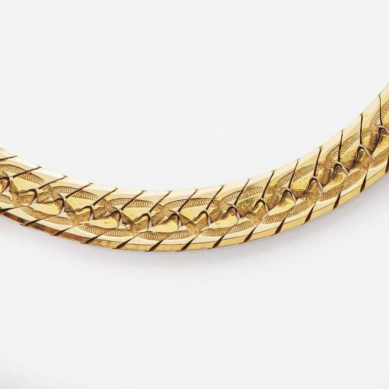 A 14K yellow gold Italian curb-link necklace, designed with an embossed texture leading along the length of the chain.