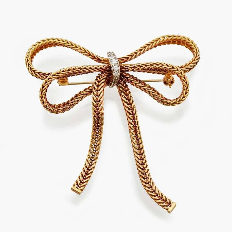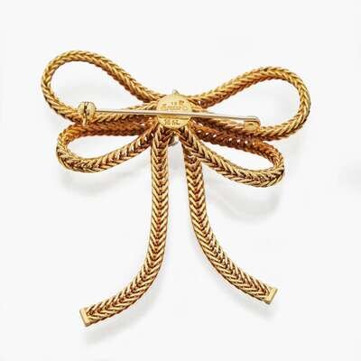 An 18K yellow gold pin by Grosse for Christian Dior, designed as a bow and centering five single-cut diamonds. Diamonds are near colorless (G - H) with VS clarity. Total estimated weight of diamonds: 0.08 carats.