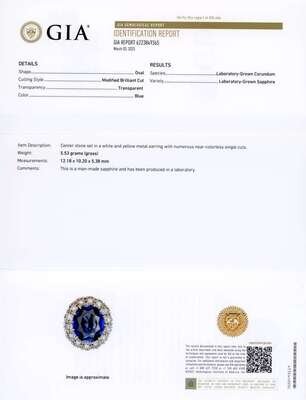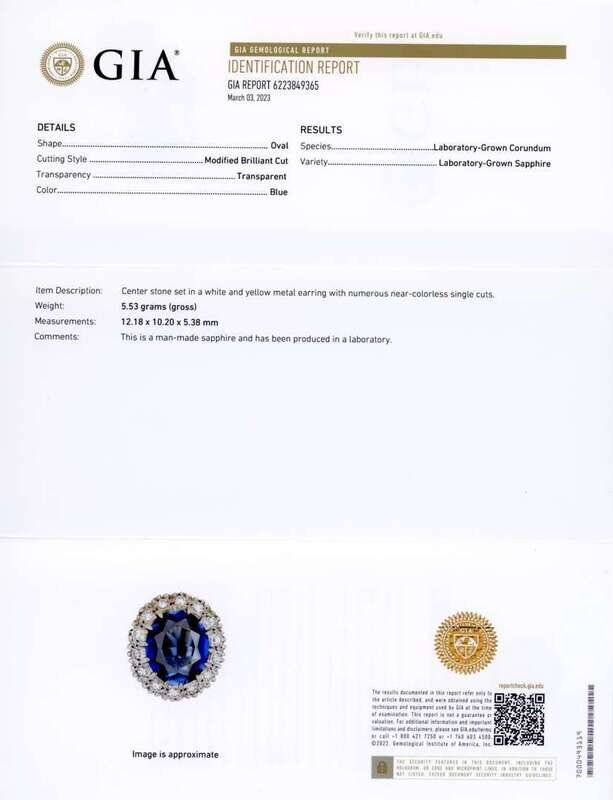 A pair of 14K yellow gold earrings, each centering an oval modified brilliant-cut transparent blue laboratory-grown corundum sapphire measuring approximately 12.18mm x 10.20mm x 5.38mm, surrounded by halos of twenty-eight single-cut diamonds. Diamonds are near colorless (H - I), with SI clarity. Total estimated weight of diamonds: 0.80 carats.