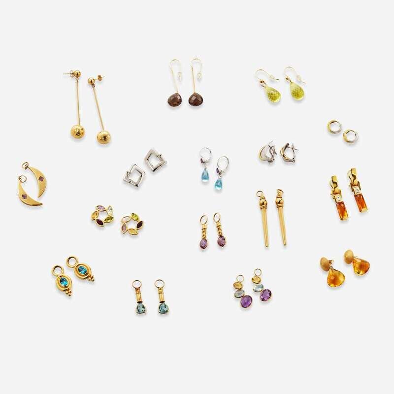A collection of assorted earrings and earring jackets including a pair of 14K yellow gold citrine drop earrings, a pair of 14K yellow gold citrine drop earrings with accent diamonds, a pair of 14K yellow gold smoky quartz drop earrings, a pair of 14K yellow gold peridot drop earrings, a pair of 14K yellow gold ball drop earrings, a pair of 14K white gold, amethyst, cubic zirconia, and blue topaz drop earrings, a pair of two-tone 14K white and yellow gold half-hoops with diamond accents, a pair of two-tone 14K yellow and white gold huggie hoops, a pair of 14K white gold square hoops, a pair of 14K yellow gold, amethyst, blue topaz, and citrine earring jackets, a pair of 14K yellow gold triangular blue topaz drop earring jackets, a pair of 14K yellow gold oval-cut blue topaz earring jackets, a pair of 14K yellow gold linear drop earring jackets, a pair of 14K yellow gold and amethyst drop earring jackets, a pair of 14K yellow gold half-moon amethyst earring jackets, and a pair of 14K yellow gold multi-gemstone earring enhancers.