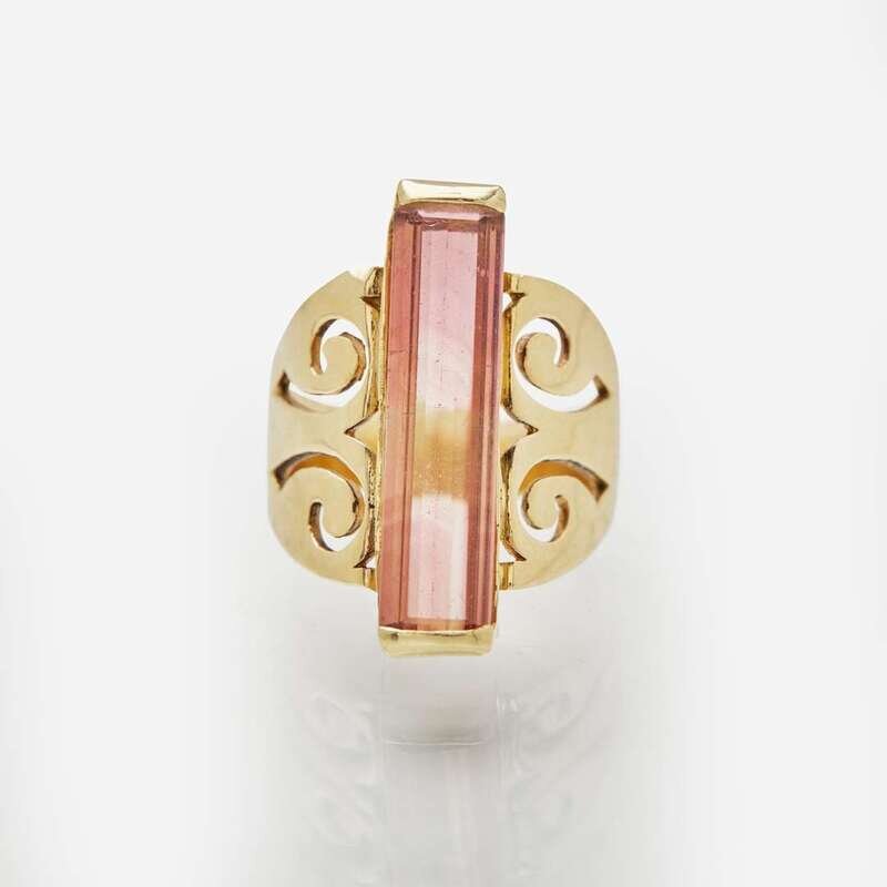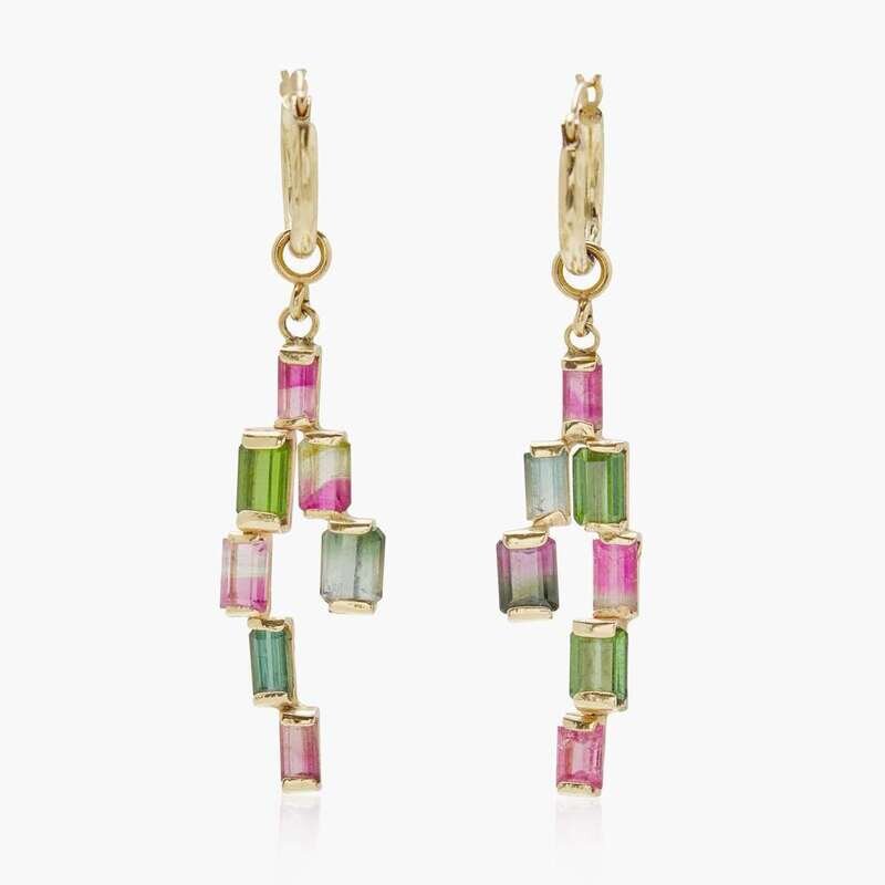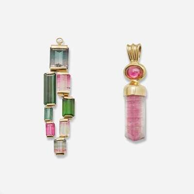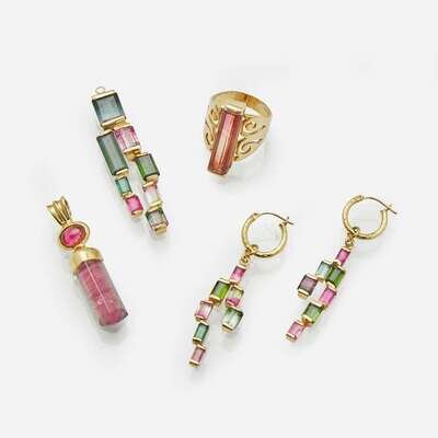 A collection of 14K yellow gold jewelry featuring pink, green, and bi-color tourmalines, including a pair of earrings with a matching pendant, a ring, and a drop pendant.
