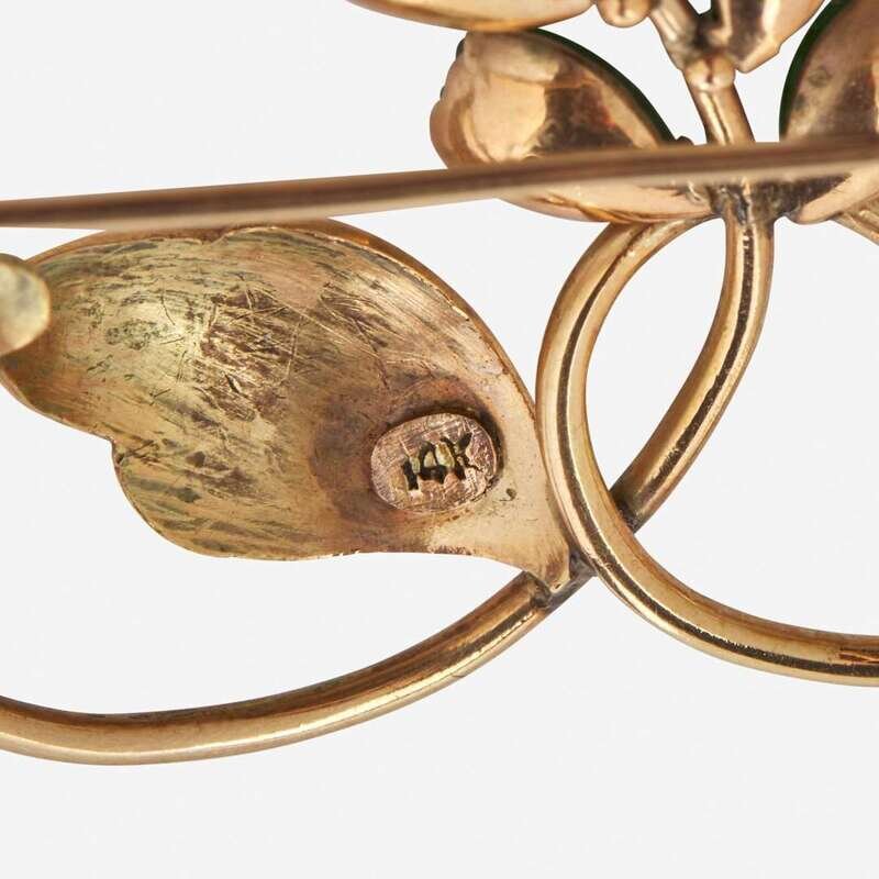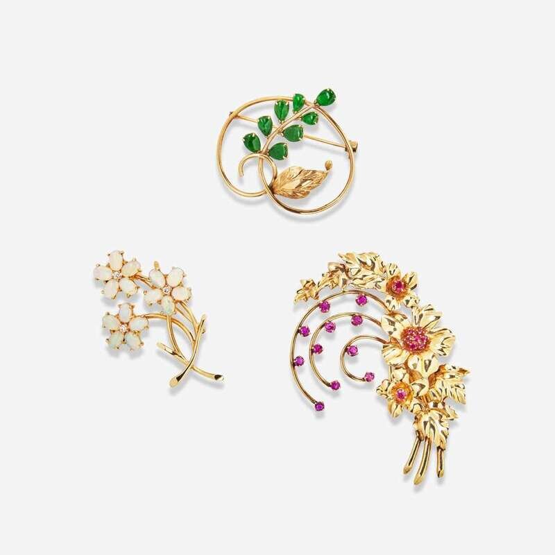 A collection of three 14K yellow gold and gemstone brooches, each designed in a foliate pattern, one set with eight pear-shape cabochon jade leaves each measuring from approximately 4.76mm x 3.32mm at the smallest to 5.80mm x 4.86mm at the largest, one set with fifteen oval-cut opals each measuring approximately 6.10mm x 4.00mm and centering three round brilliant-cut diamonds, approximately 0.10 carats altogether, near colorless (H - I), with VS2 - SI2 clarity, and one set with twenty round-cut rubies measuring from approximately 1.50mm at the smallest to 2.80mm.