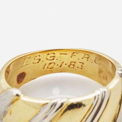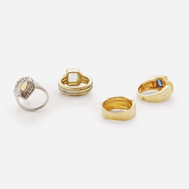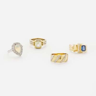 A group of 14K gold ladies rings, including a 14K white gold ring featuring a pear cabochon opal surrounded by a halo of fourteen single-cut diamonds, approximately 0.10 carats altogether, near colorless (I - J), with SI clarity, a two-tone 14K yellow and white gold ring featuring an emerald-cut light blue synthetic spinel with a white gold twisted rope accent on the shank, a 14K yellow gold ring featuring an emerald-cut sapphire accented by four round brilliant-cut diamonds, approximately 0.08 carats altogether, near colorless (H - I), with SI clarity, and a two-tone 14K yellow and white gold band. Total estimated weight of diamonds: 0.18 carats.
