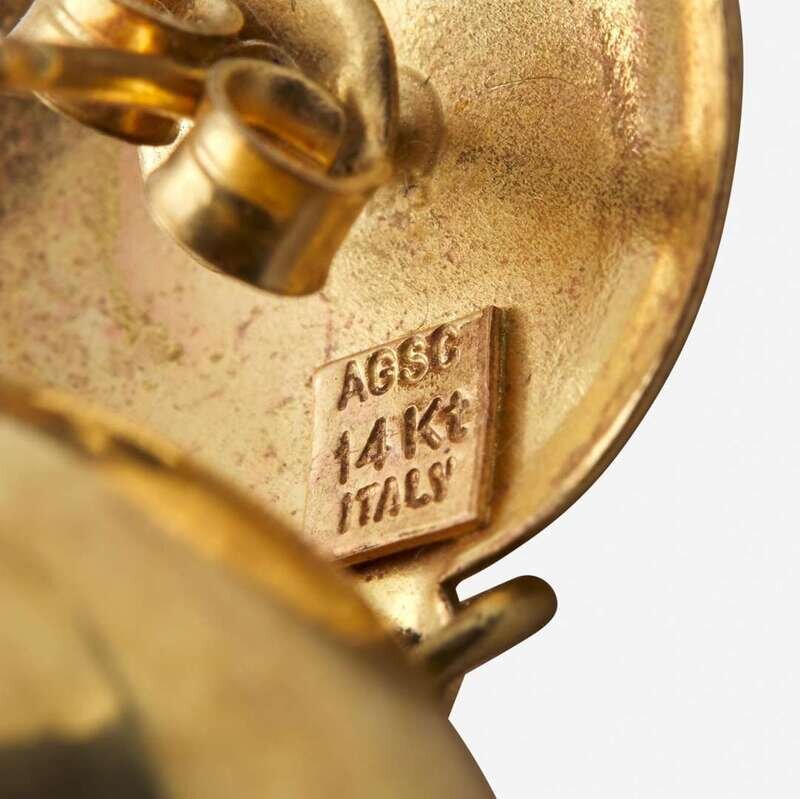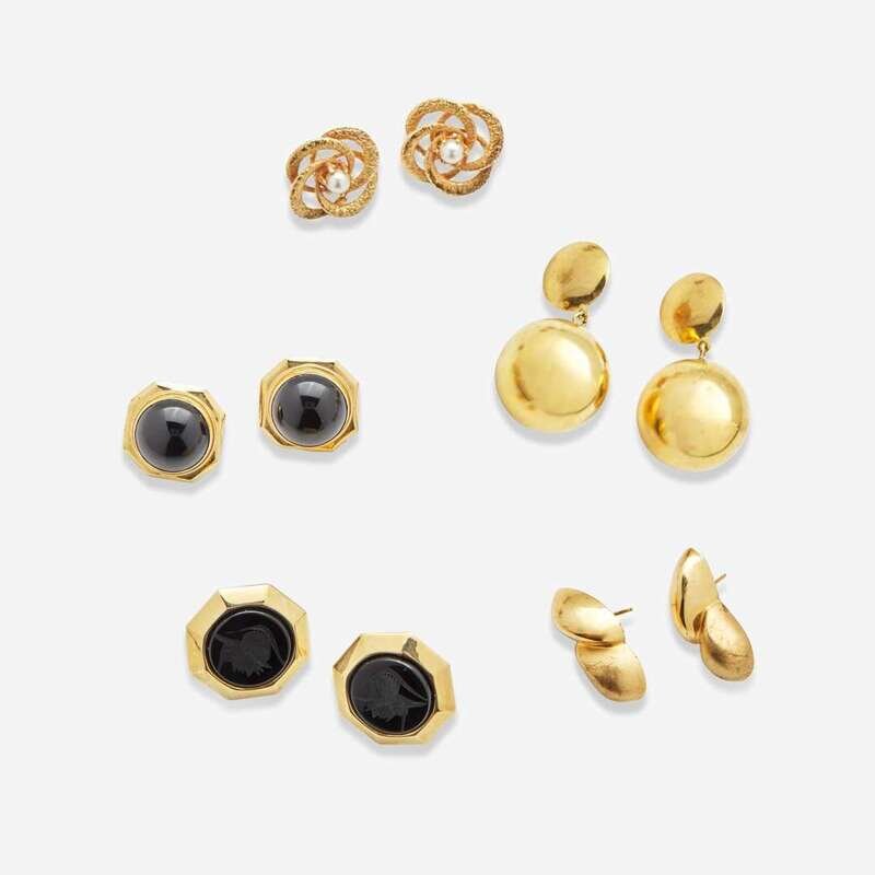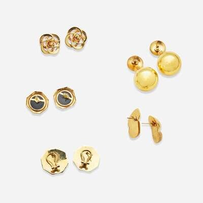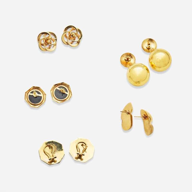 A five-piece collection of 14K yellow gold earrings, one for pierced ears with omega clip backs featuring black onyx intaglios, one in a freeform design on posts with tension backs, one featuring two black cabochon onyx each measuring approximately 14.35mm on posts with tensions backs, one featuring a textured interlocking circle designed centering two cultured pearls each measuring approximately 5.00mm on posts with tension backs, and one made in Italy and designed as gold ball drops on posts with tension backs.