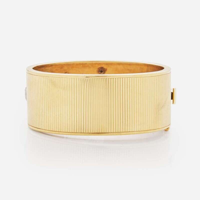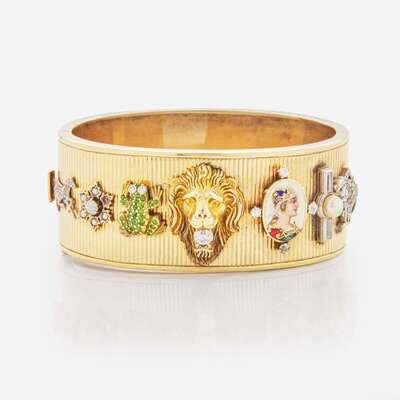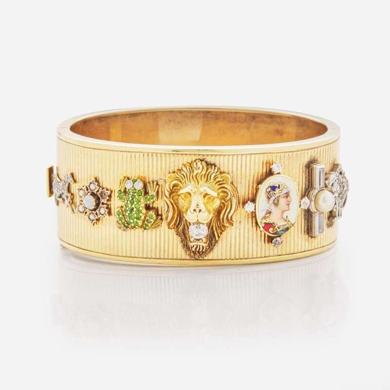 A 14K yellow gold retro bangle bracelet set with seven applied decorative charm emblems, including a monkey featuring foil-backed rose-cut diamonds, a charm featuring two baguette-cut diamonds weighing approximately 0.30 carats altogether and a cultured pearl measuring approximately 4.75mm, a painted cameo with rose-cut diamond and enamel accents and four single-cut diamonds, approximately 0.08 carats altogether, a lion set with an old European-cut diamond weighing approximately 0.28 carats, a frog featuring demantoid garnets and diamond eyes, a snowflake featuring an opal and seed pearls, and a horse featuring rose-cut diamonds. Diamonds are near colorless (I - J), with VS - SI clarity. Total estimated weight of diamonds: 0.66 carats.
