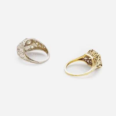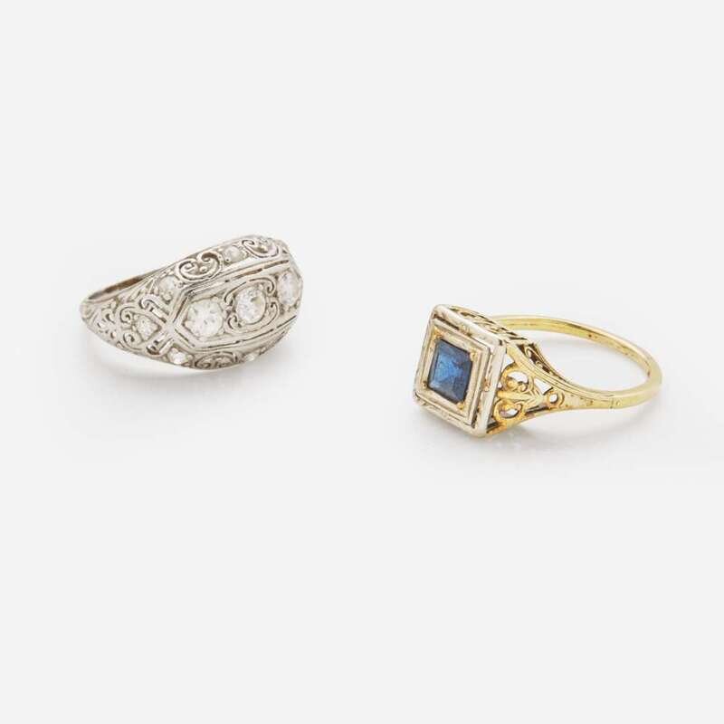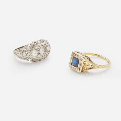A collection of two rings, including a 14K two-tone yellow and white gold ring designed in an openwork style, centering a step-cut sapphire measuring approximately 4.68mm x 4.95mm, and a platinum filigree ring set with eleven old European-cut diamonds. Diamonds are near colorless to faint color (I - K), with SI - I clarity. Total estimated weight of diamonds: 0.50 carats.