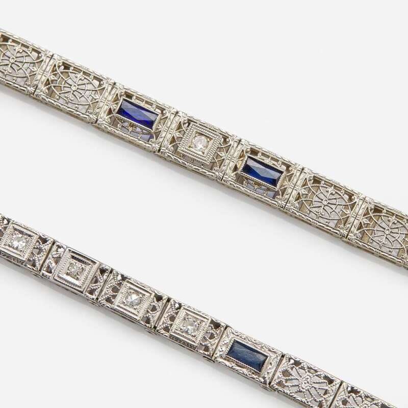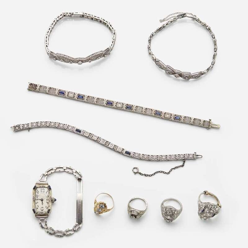 A collection of assorted Art Deco jewelry, including an 18K white gold seventeen-jewel J.E. Caldwell & Co. watch set with four single-cut diamonds on a gold-filled adjustable bracelet, four 14K white gold bracelets set with diamonds and sapphires, two platinum rings set with old European-cut diamonds, a 14K white gold filigree ring set with diamonds, and a 14K yellow gold ring set with round brilliant-cut diamonds. Total estimated weight of diamonds: 5.10 carats.