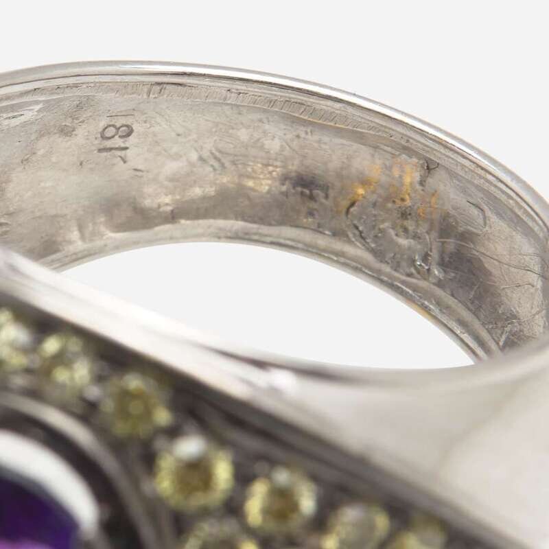 An 18K white gold ring, designed as an eye centering an oval-cut amethyst measuring approximately 12.06mm x 9.79mm x 5.89mm as the pupil, surrounded by numerous yellow and near-colorless (G - H) diamonds. Forty-four diamonds in total, with VS clarity. Total estimated weight of diamonds: 1.12 carats.