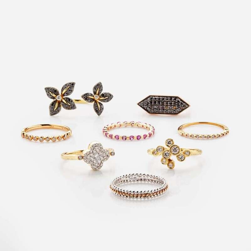 An assorted collection of 14K and 18K gold rings, including a 14K rose gold ring with black diamonds, a 14K rose gold band with diamonds, a 14K yellow gold ring featuring a cluster of diamonds, a 14K flip ring featuring black onyx and diamonds, a 14K white and rose gold band, a 14K yellow gold ring designed as flowers with black and white diamonds, an 18K yellow gold band featuring pink sapphires, and an 18K yellow gold band with diamonds,