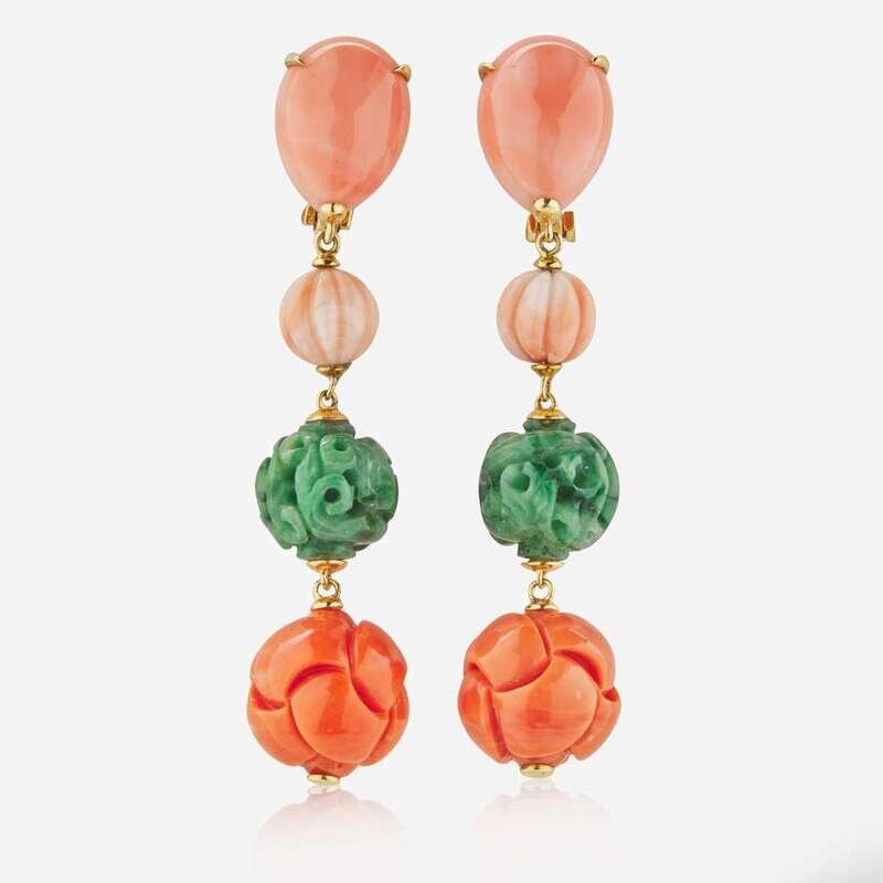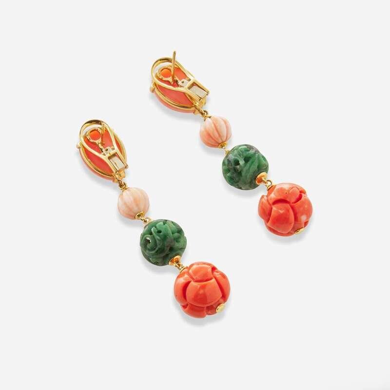 A pair of 18K yellow gold dangle earrings on stud posts with omega clip backs, with two pear-shape coral each measuring approximately 15.17mm x 11.59mm, two carved coral beads each measuring approximately 8.44mm, two carved coral beads each measuring approximately 13.40mm, and two carved jade beads each measuring approximately 12.00mm.