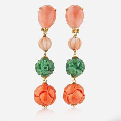 A Pair of 18K Yellow Gold, Jade, and Coral Earrings