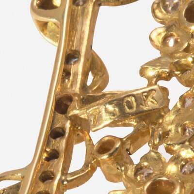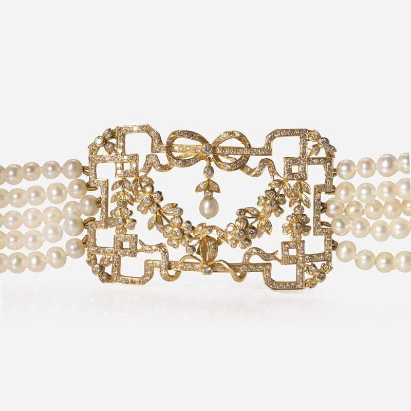 A pearl necklace designed as five strands of approximately four-hundred cultured pearls each measuring approximately 4.15mm, centering an 18K yellow gold pendant of foliate design, topped by a bow suspending a pearl drop measuring approximately 3.90mm and set with round brilliant-cut diamonds, and ending in a 14K yellow gold clasp. Total estimated weight of diamonds: 2.00 carats.