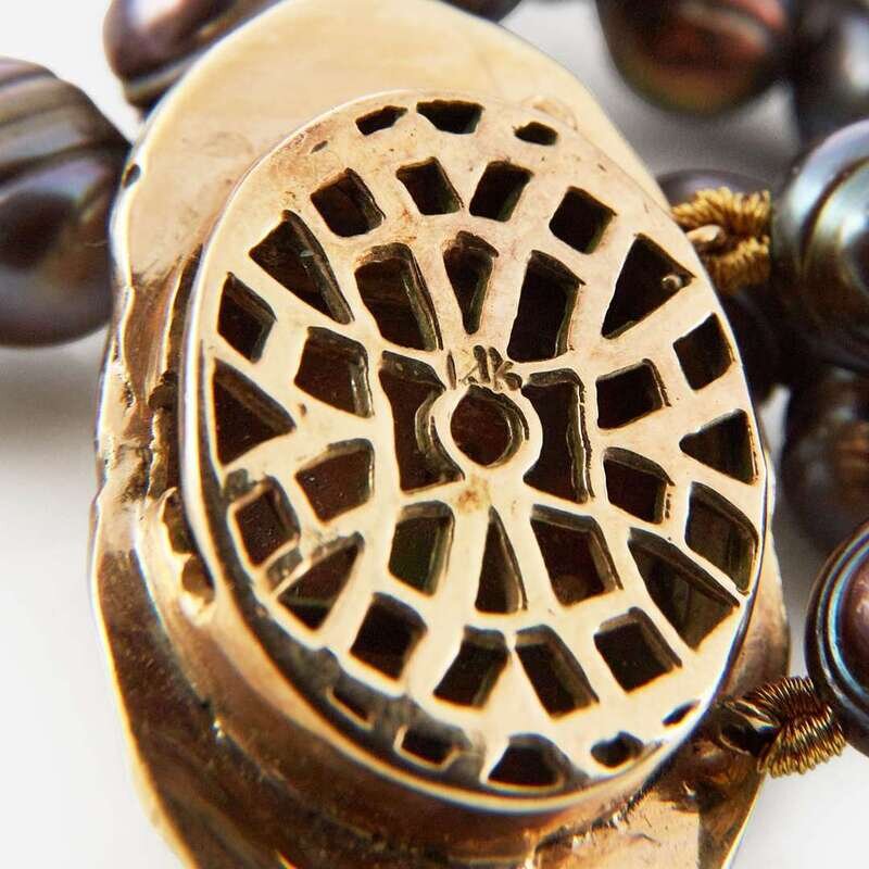 A double-strand black pearl necklace with black-ringed oval freshwater pearls each measuring approximately 7.8mm x 6.2mm, coming together with a 14K yellow gold clasp set with a freeform opal measuring approximately 11.90mm x 6.90mm, and featuring a two-tone 14K yellow and white gold enhancer pendant set with an oval Australian fire opal weighing approximately 10.64 carats.