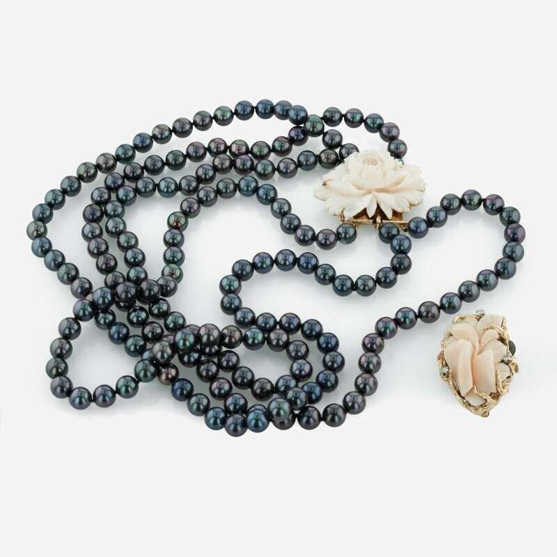 A Set of Coral, Black Pearl, and Diamond Jewelry
