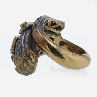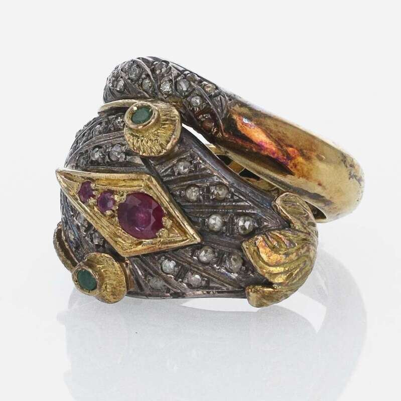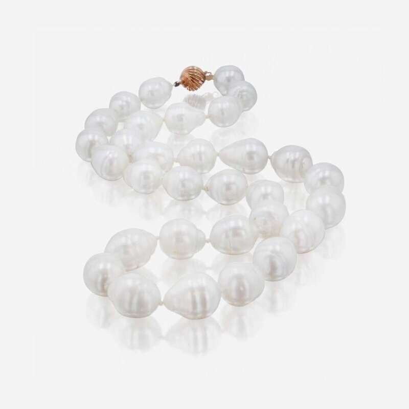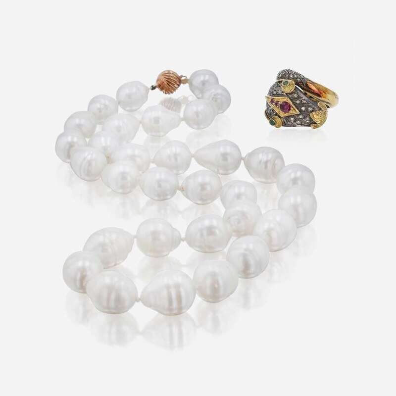 A men's ring made of yellow gold and silver, designed as a snake and set with diamonds, rubies, and emeralds, and a single-strand necklace, comprised of thirty-one lustrous graduated white Baroque pearls, with 14K yellow gold clasp. Diamonds have light color (S - Z), and I clarity. Total estimated weight of diamonds: 0.90 carats.
