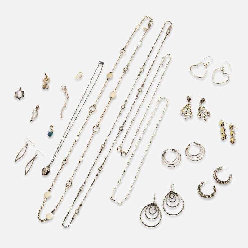 A miscellaneous collection of silver and gemstone jewelry by contemporary jewelry designers, including John Hardy, Konstantino, Lagos, Ippolita, and Alexis Bittar. The lot includes five silver necklaces, seven pairs of earrings, and five pendants.