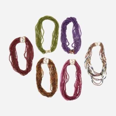 A collection of six torsade necklaces including a multi-strand necklace featuring amethyst beads each measuring approximately 5.00mm each, with a 14K yellow gold and gem-set clasp, a multi-strand necklace featuring faceted garnet beads each measuring approximately 3.30mm, with a gold-plated clasp, a multi-strand necklace featuring faceted tsavorite garnet beads with a 14K gold and diamond clasp, a multi-strand necklace featuring various multi-color faceted gemstone beads each measuring approximately 3.20mm with a 14K gold clasp, a multi-strand necklace featuring faceted tourmaline beads each measuring approximately 2.80mm with a gold-plated clasp, and a multi-strand necklace featuring faceted ruby and pink sapphire beads with a 14K yellow gold clasp.