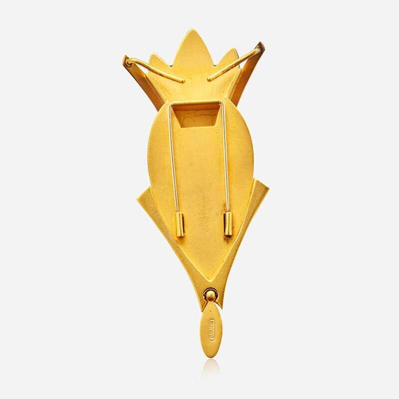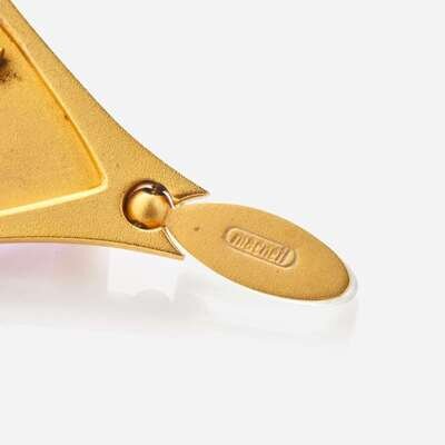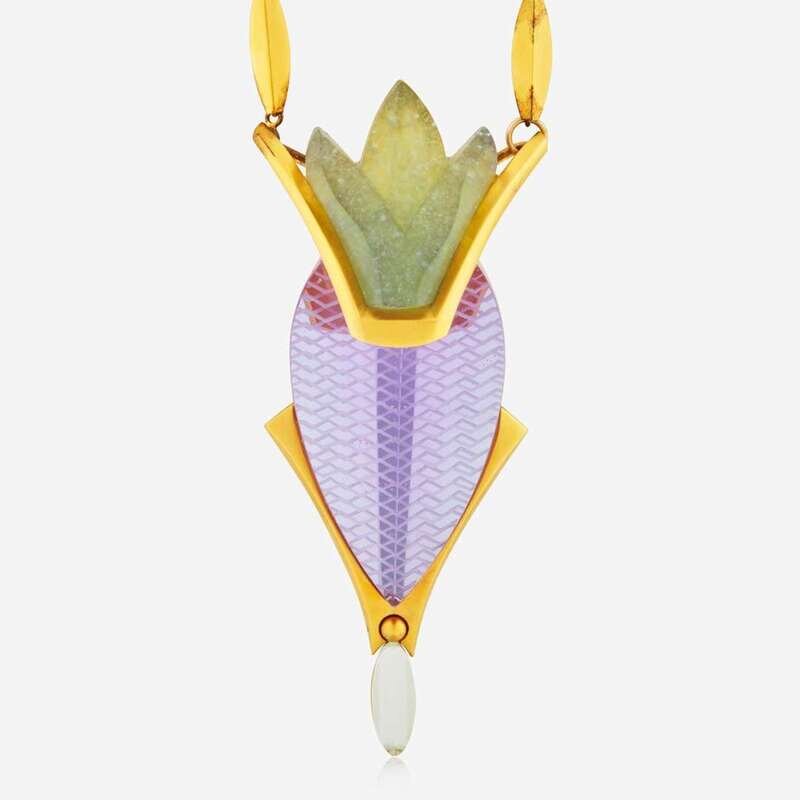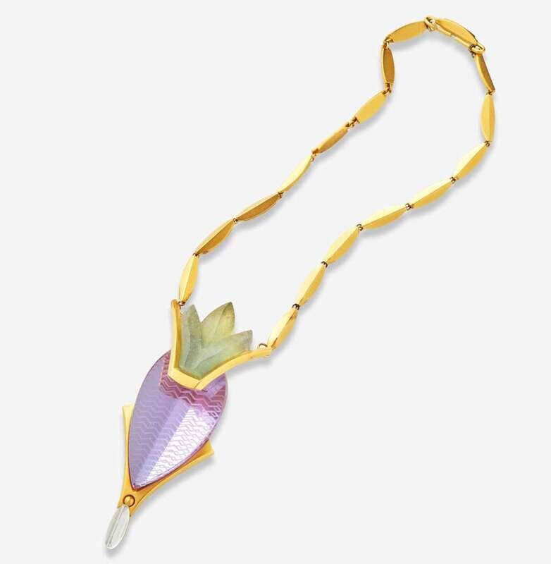 A 24K gold-plated brass necklace by Linda McNeil titled "River Breeze" circa 2003, featuring a removable pendant also functioning as a brooch fashioned from tinted lavender optical polished glass with an engraved chevron pattern, a section of carved green pate de verre, and an oval-cut piece of clear acid polished glass. Accompanied by additional links to adjust necklace length, original box, and paperwork.