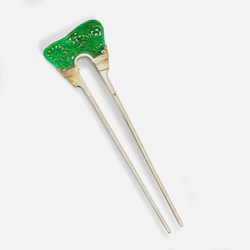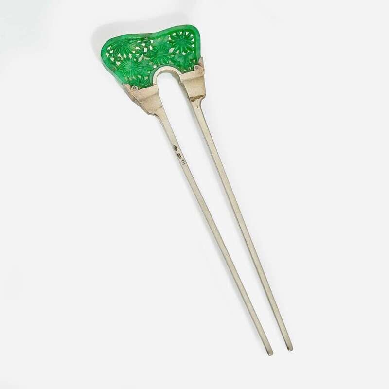 A 14K white gold hairpin, featuring jade carved in an openwork floral design.