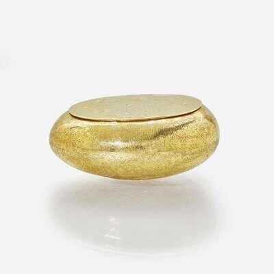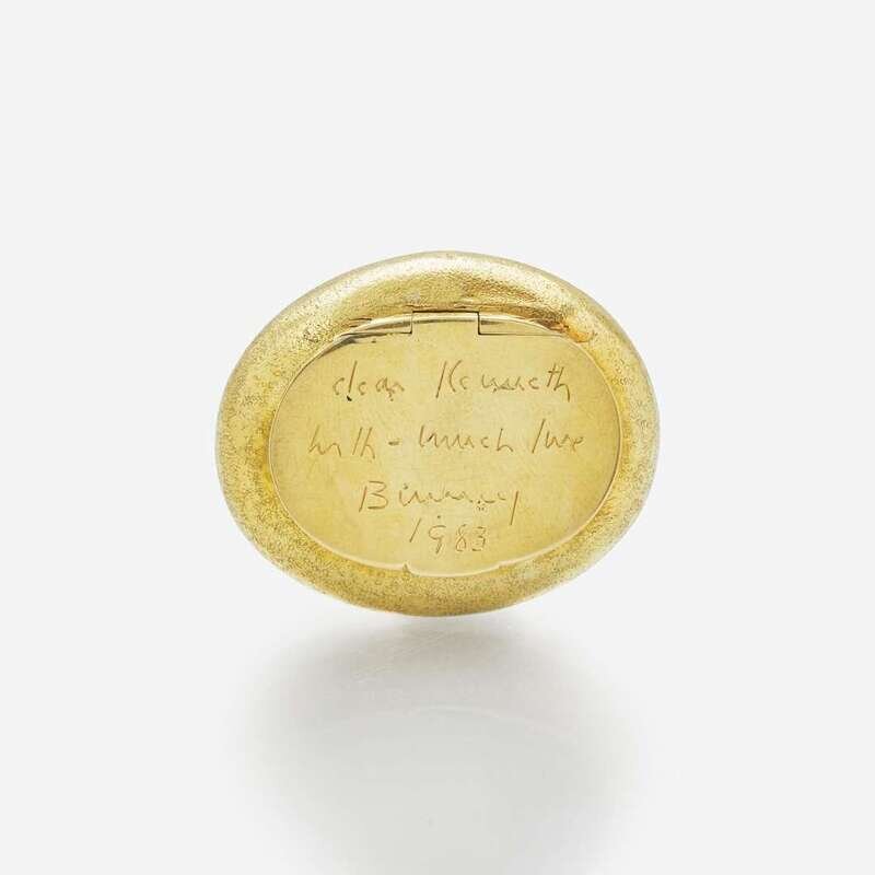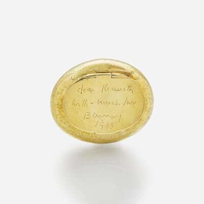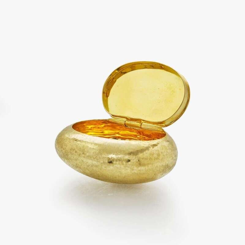 An 18K yellow gold pebble pillbox, designed by Jean Schlumberger for Tiffany & Co. with textured gold finish, inscribed from Bunny Mellon to Kenneth.