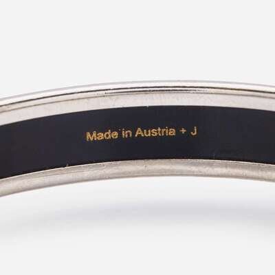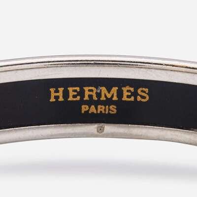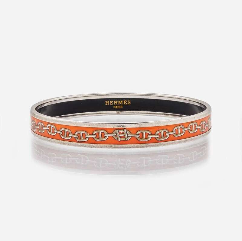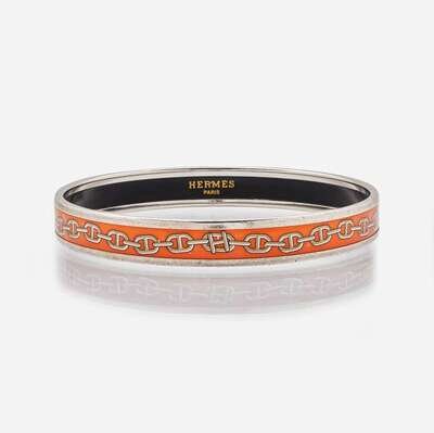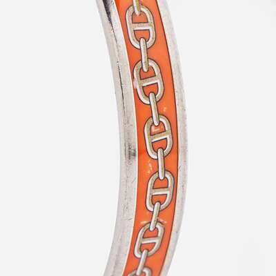 A bangle bracelet by Hermès, designed as a printed orange enamel with a chaine d'ancre design on palladium-plated hardware, circa 2000's. Accompanied by original Hermès box.