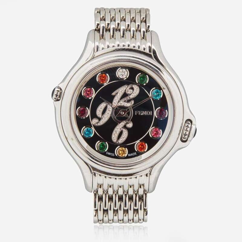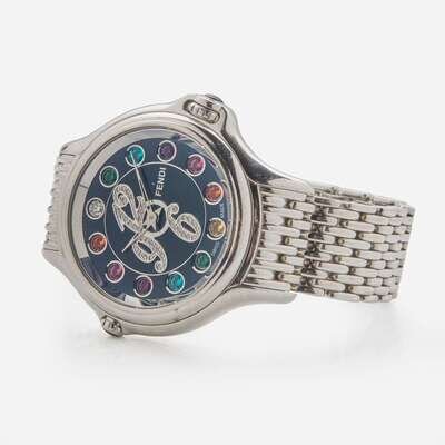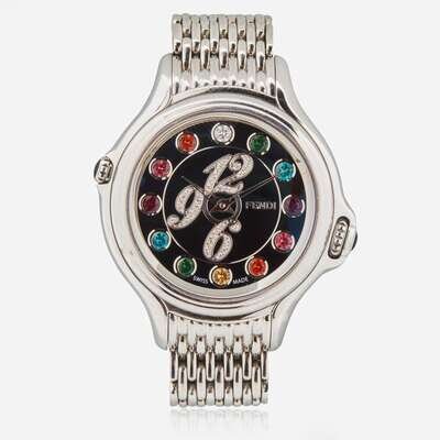 A Fendi Crazy Carats watch made of stainless steel, on a stainless steel bracelet with a deployant clasp. The dial is black with gemstones at hour intervals, as well as diamond-set Arabic numerals at the 12 o'clock, 6 o'clock, and 9 o'clock hours. The gemstones at hour intervals can be switched using the crown at 3 o'clock, so the wearer has the option of a multi-color array of gemstones, pink gemstones, or blue gemstones.