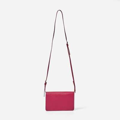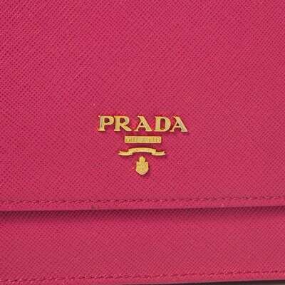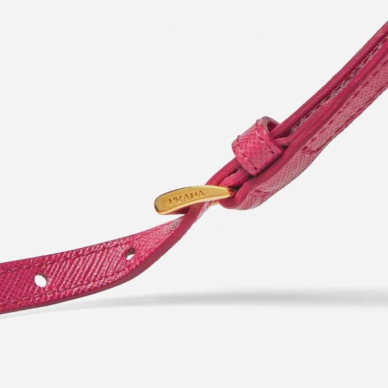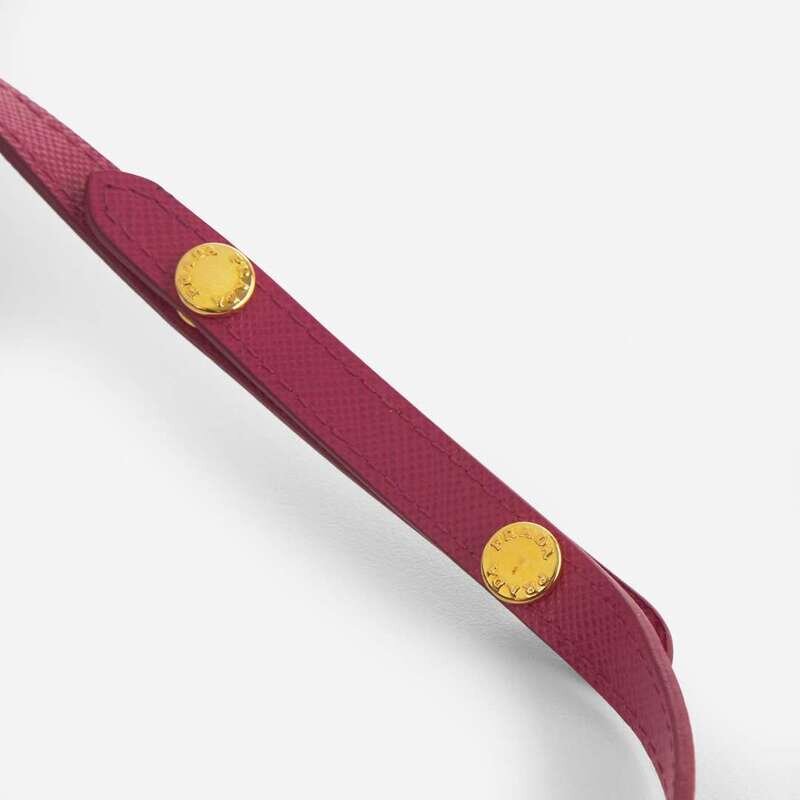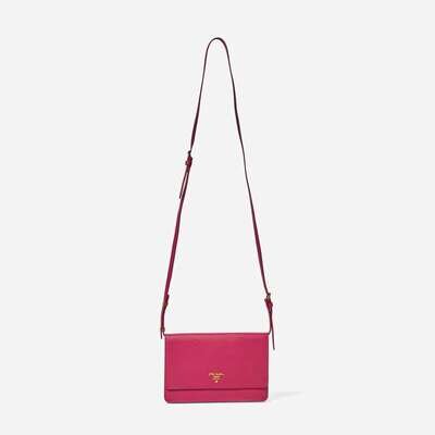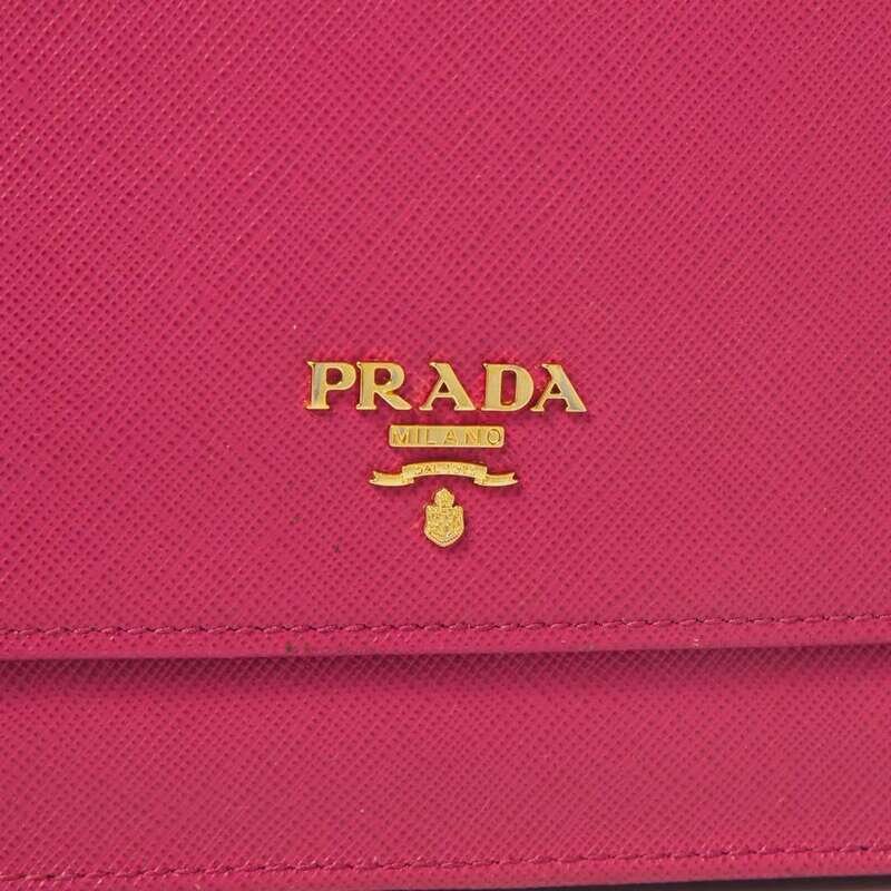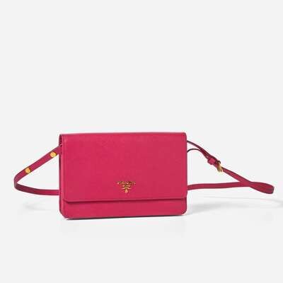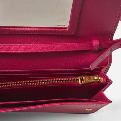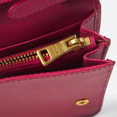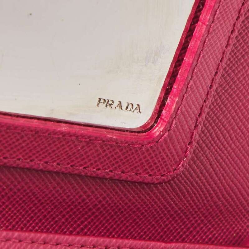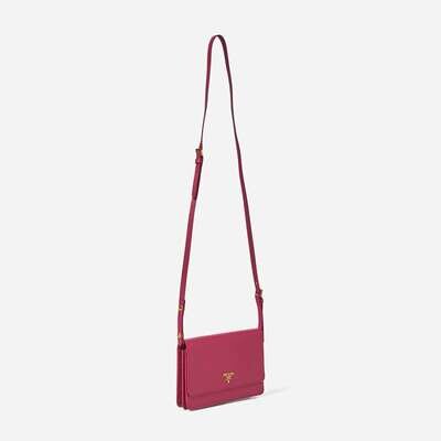 A Prada Saffiano Lux Wallet on strap, with pink Saffiano leather, gold-tone hardware, and an adjustable shoulder strap. The interior is lined with pink Saffiano leather and pink textile, with several pockets, card pockets, a zipped pocket acting as a divider, and a small mirror on interior of flap. Accompanied by Prada box.