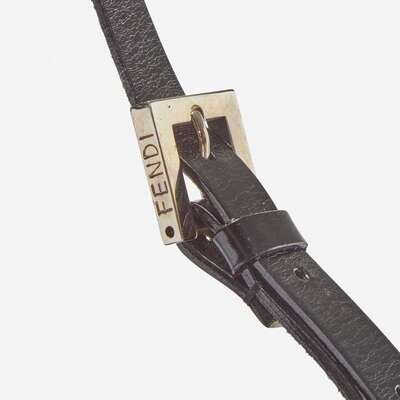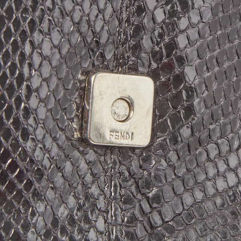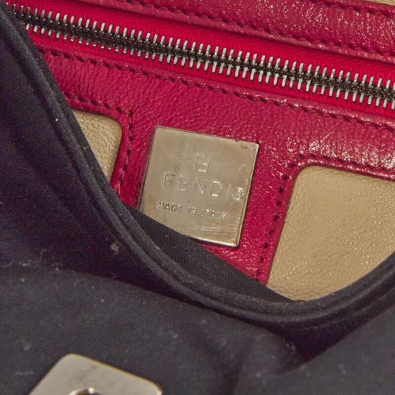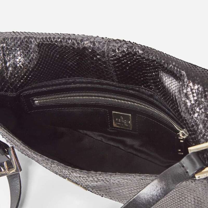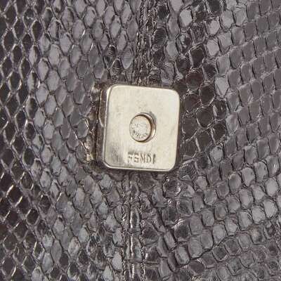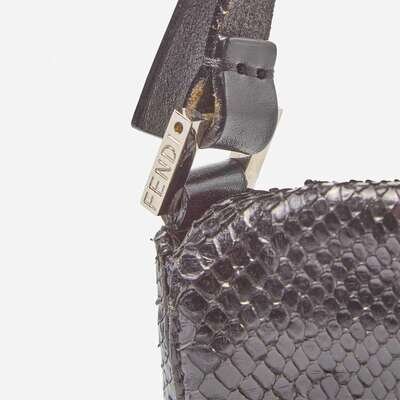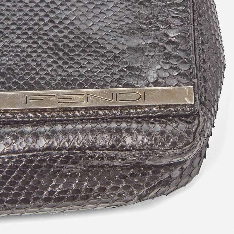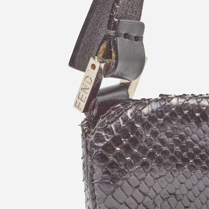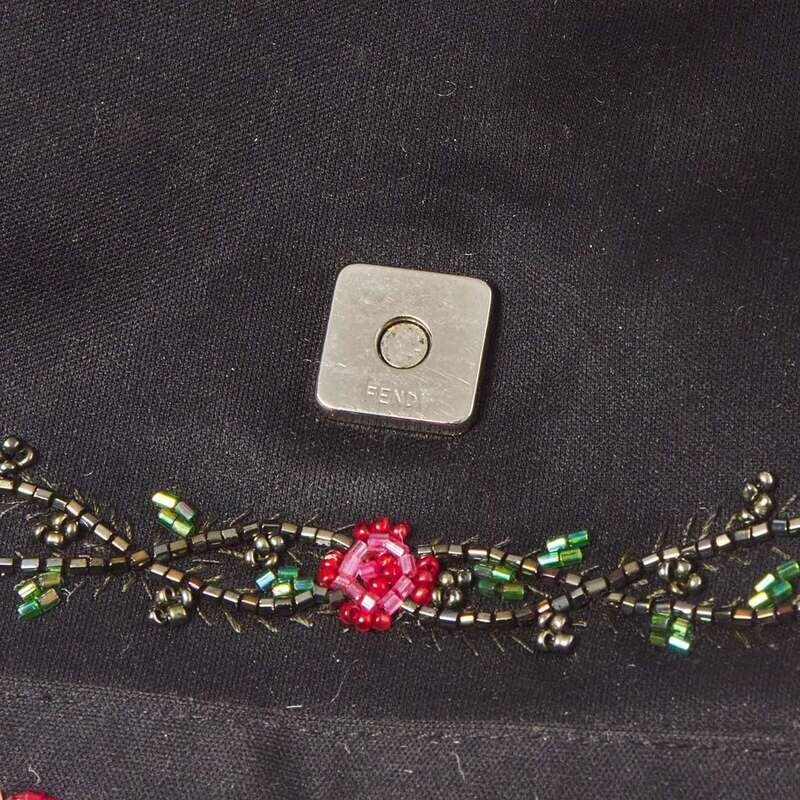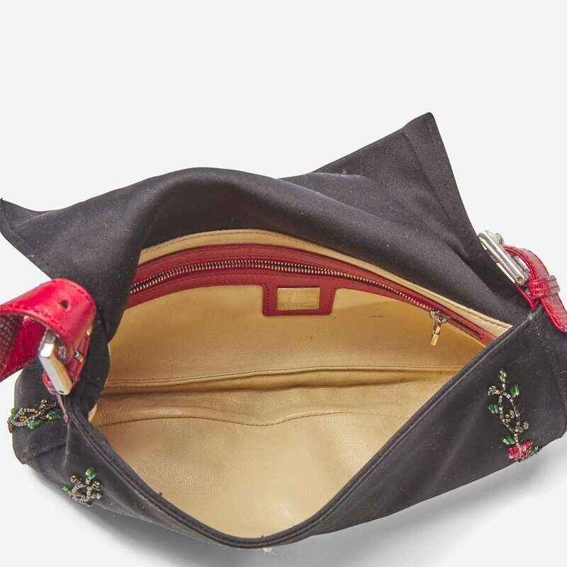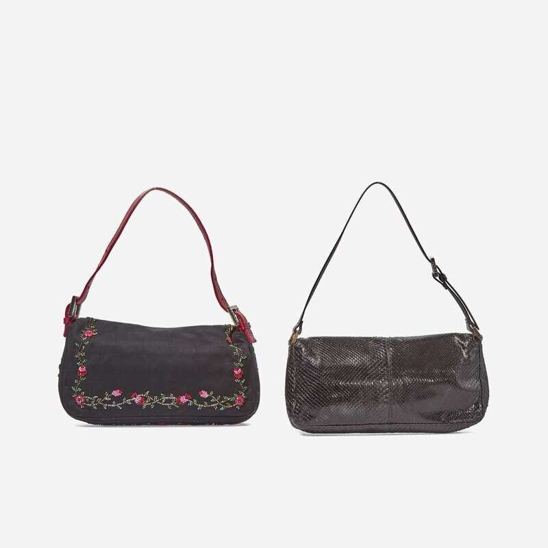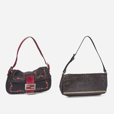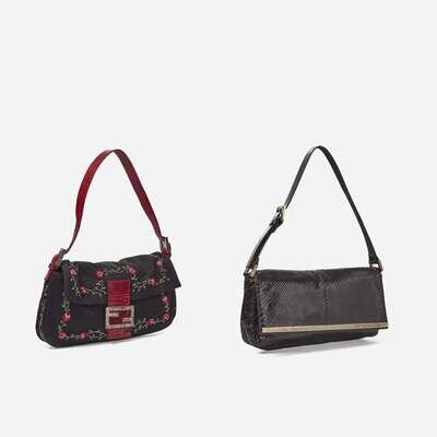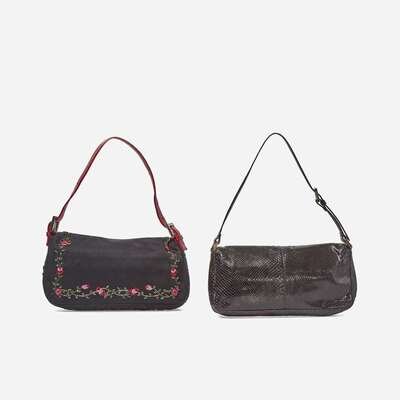 A collection of two Fendi baguette-style purses from the early to mid 2000's, one designed in a soft black textile with red snakeskin leather accents and floral beading with white metal hardware and rhinestone embellishing, and the other designed in a boxy black style, with black snakeskin leather and a smooth black leather strap, with white metal accents.