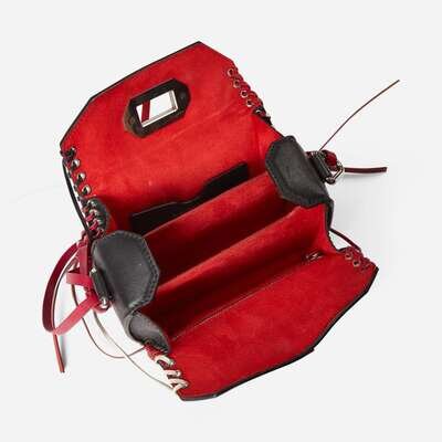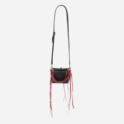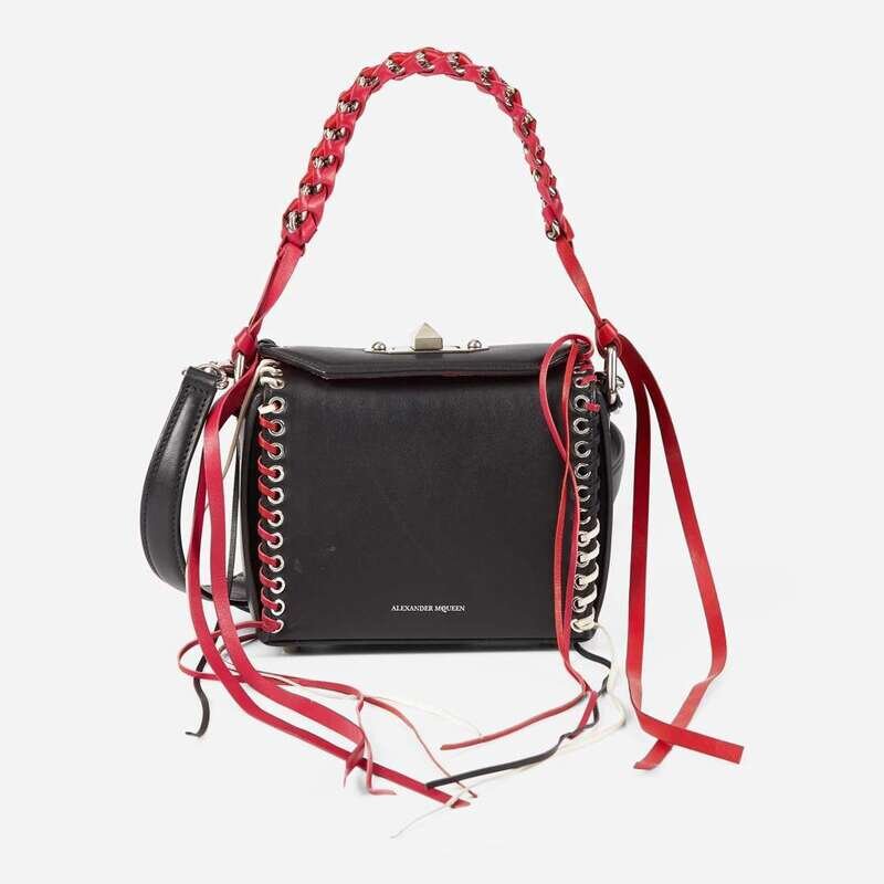 A crossbody shoulder bag by Alexander McQueen, crafted from textured calfskin leather in black with white metal eyelets woven throughout with cords of red, pink, black, and white leather ending in fringe. The bag features a white metal turn lock and hardware, with a short chain strap braided with pink and red leather, as well as a long smooth black leather strap that is detachable using white metal hardware clasps. The bag opens to reveal a red microfiber partitioned interior with a card pocket on one side and a zip pocket on the other.