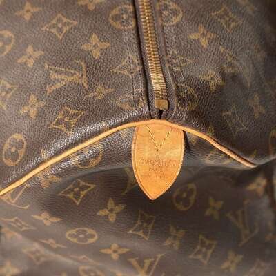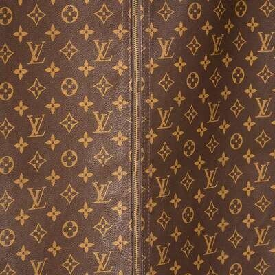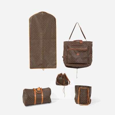 A group of five leather pieces by Louis Vuitton, all designed in the classic coated canvas, brown with lighter brown Louis Vuitton all-over monogram, including a simple zip-closure garment bag, a large garment bag with a handle, shoulder strap, and multiple pockets, a large tote bag, a bucket bag, and a Louis Vuitton Keepall 50.