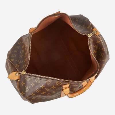 A Louis Vuitton Monogram Keepall 45, designed as a duffel crafted from signature Louis Vuitton monogram on coated canvas, with vachetta leather trim, rolled top handles, and polished brass hardware, with a central brass zip opening to reveal a main compartment lined with chocolate brown textile interior.