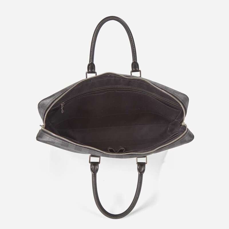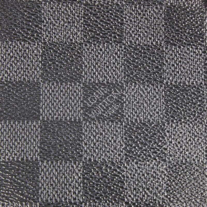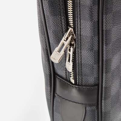A Louis Vuitton Porte Document Voyage in black and gray Damier Graphite coated canvas with black leather accents and double black leather rolled handles, with white metal hardware. The zipper down the middle opens to reveal a roomy interior lined with black textile, with sever slip pockets, one large zipped pocket, and pen pockets along the sides.