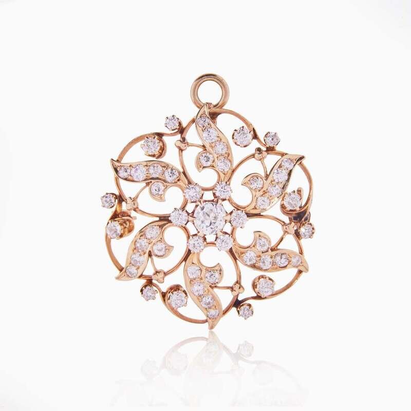 An antique brooch fashioned in a floral design of 10K yellow gold, set with forty-nine old European-cut diamonds. Diamonds are near colorless (G - I), with SI clarity. Total estimated weight of diamonds: 2.00 carats.
